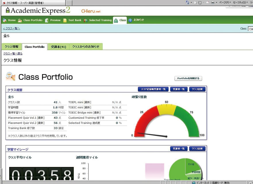 『スーパー英語 Academic Express 2』は、テストの点数以外にも日々の継続により学習マイレージがたまる方式だが、「獲得マイルが5000マイルを超えた学生がいた」「今週はリーディングを多く学習する学生が多かった」等、学習の量や傾向について、調査結果を毎週フィードバックしたという。