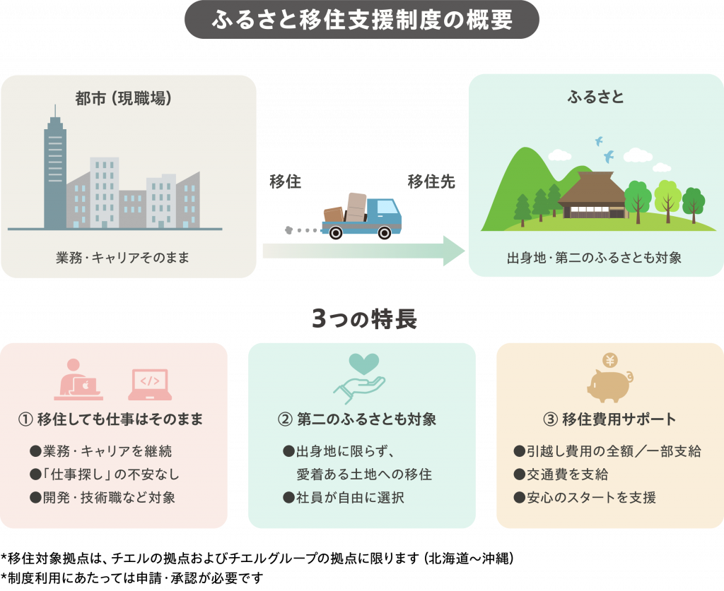 チエルは全国各地に営業所やグループ会社を展開しており、特に開発技術職を中心とした多くの社員が、場所にとらわれない柔軟な働き方が可能な環境にあります。近年、地方移住への関心が高まる一方で、「移住先での仕事探し」が大きなハードルとなっています。そこで弊社は、社員が現在のキャリアや業務を継続したまま、自身の生まれ故郷や、心から「ふるさと」だと感じる土地へ移住できる環境を整備いたしました。本制度を通じ、社員のエンゲージメント向上を図るとともに、全国各地の地方創生を応援してまいります。(制度利用にあたっては、申請・承認が必要)